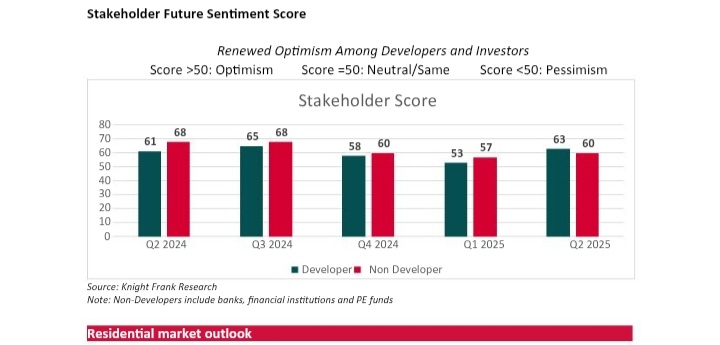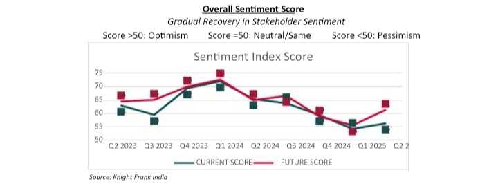 The 45th edition of the Knight Frank-NAREDCO Real Estate Sentiment Index for Q2 2025 (April-June) marks a significant shift in the mood of the Indian real estate sector. Following a year-long moderation in sentiment, stakeholders are beginning to look beyond short-term global uncertainties and are anchoring their expectations on India’s structural economic strength, accommodative monetary policy, and robust demand in premium residential and office segments.
